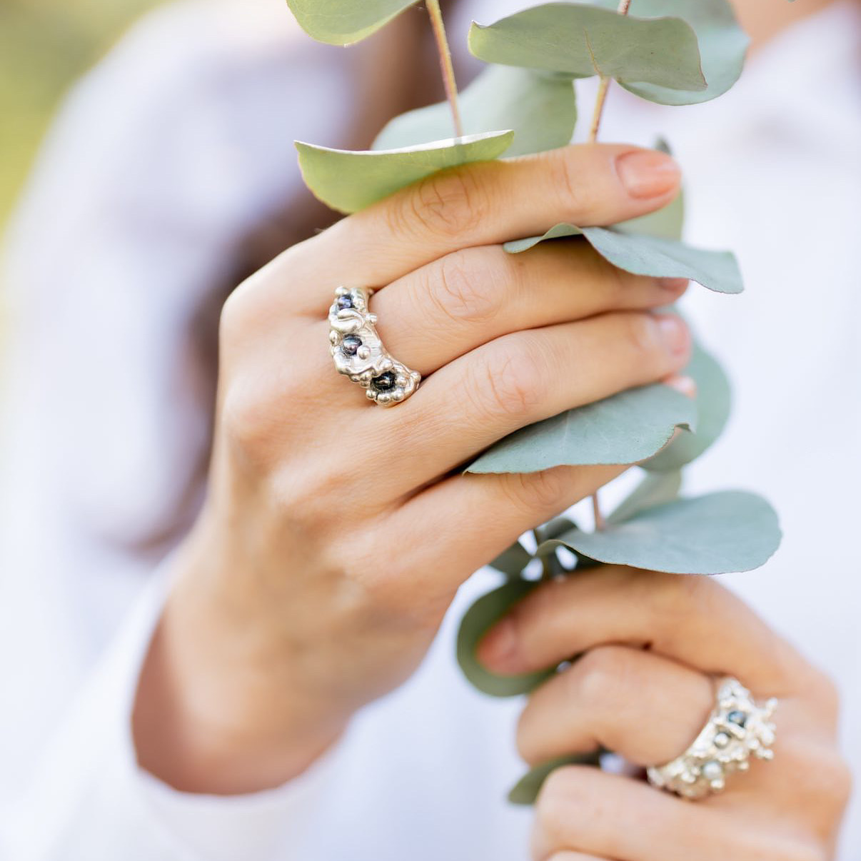 Stříbro v kolekci Lympha není hladké. Je modelované, vrstvené, místy hrubší. Perly do něj nejsou „vsazené jako ozdoba“, ale přirozeně zapuštěné.