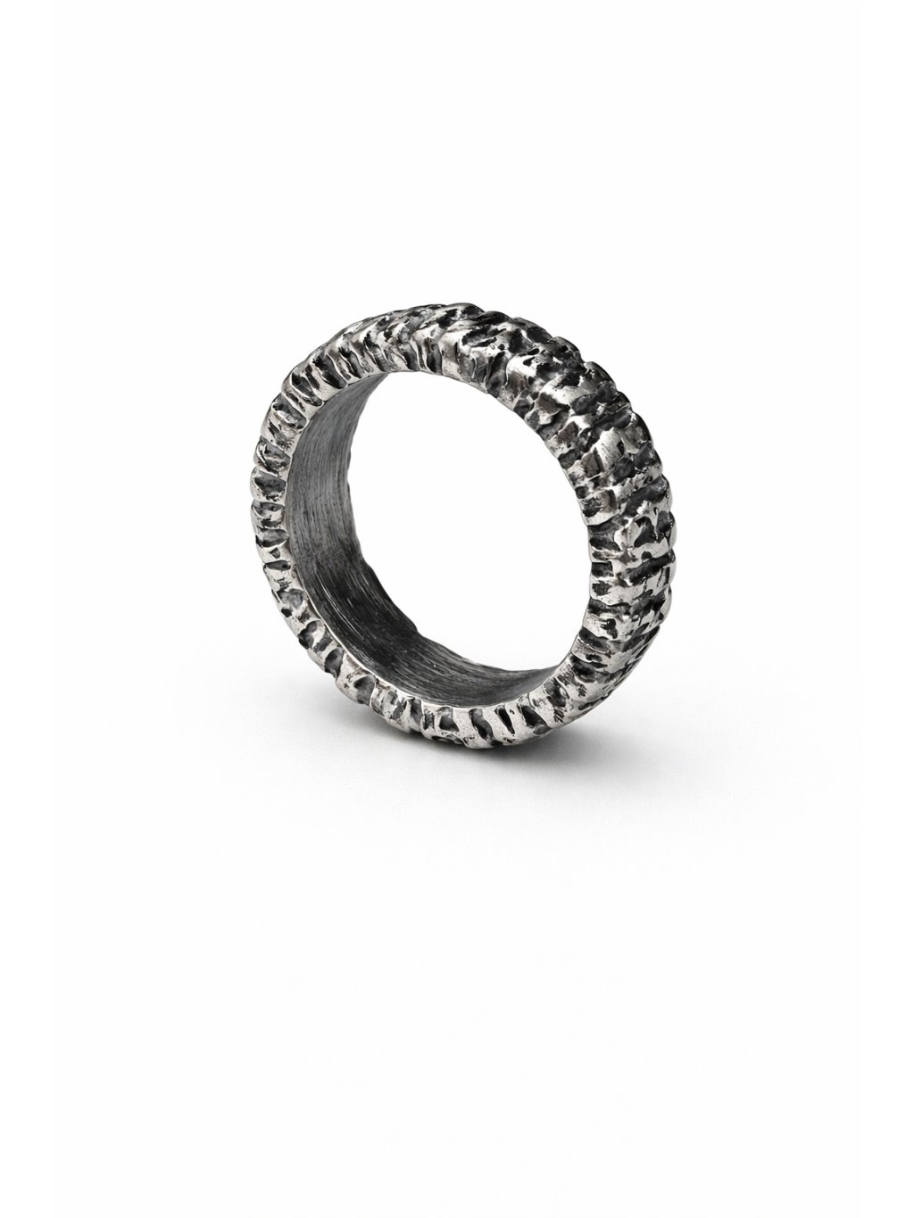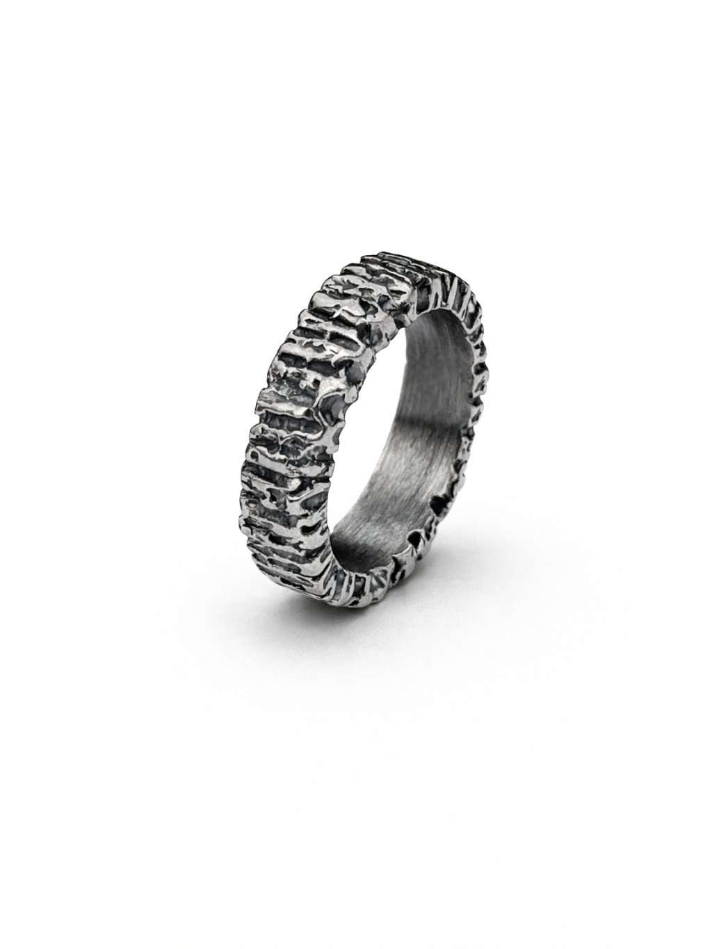 Struktura prstenu připomíná přírodní prvky, jako kůru stromu či ohořelý kus dřeva. Je to šperk, který spojuje eleganci a organickou krásu.