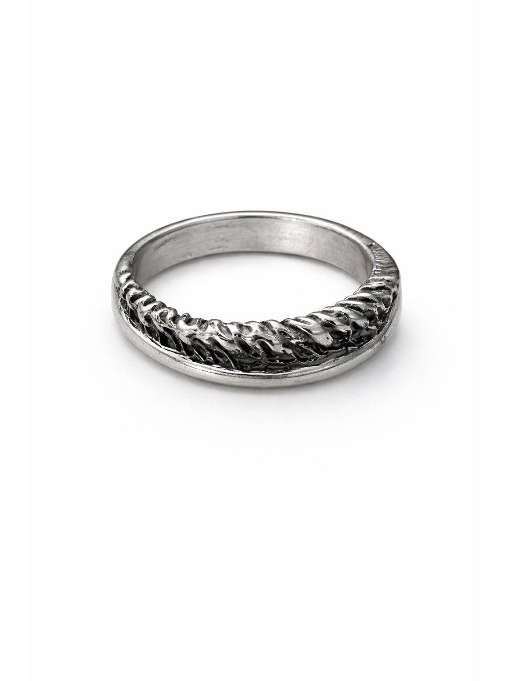 Struktura prstenu s řezy a vrypy připomíná přírodní prvky, jako kůru stromu, nebo ohořelý kus dřeva. Je to šperk, který spojuje eleganci a organickou krásu.
